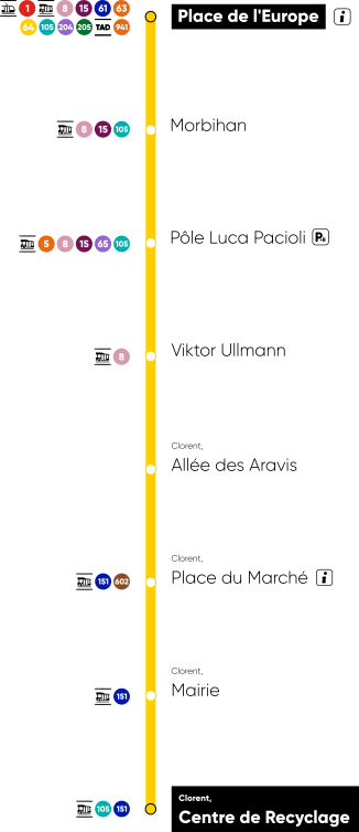 La ligne 103 est une ligne suburbaine qui relie la ville-centre à la commune de Clorent. Elle dessert le quartier de la Place de l’Europe, le pôle universitaire Luca Pacioli, les zones artisanales de la route de Clorent ainsi que le marché et la mairie de Clorent.