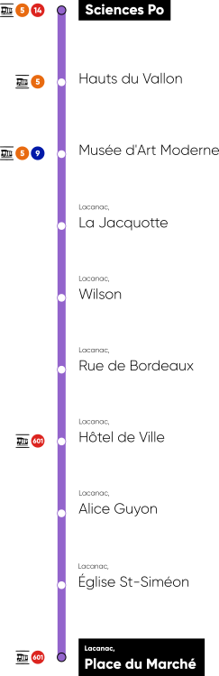 La ligne 104 est une ligne suburbaine qui relie la ville-centre à la commune de Lacanac. Elle dessert le Campus de Sciences Politiques, le quartier du Vallon, le Musée d’Art Moderne, le nord du bois de Lacanac, l’Hotel de Ville et le quartier historique de Lacanac ainsi que les Halles de Lacanac.