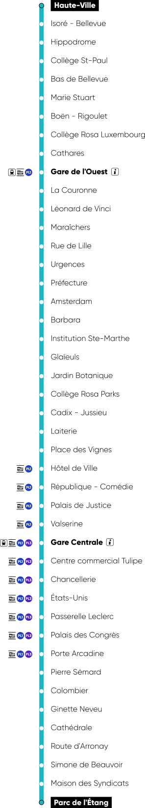 La ligne PL2 est une ligne nocturne radiale qui dessert la ville d’ouest en est. Elle relie le centre-ville aux quartiers de la Préfecture et de la Haute-Ville en desservant le Pôle d’Échanges de la Gare de l’Ouest.